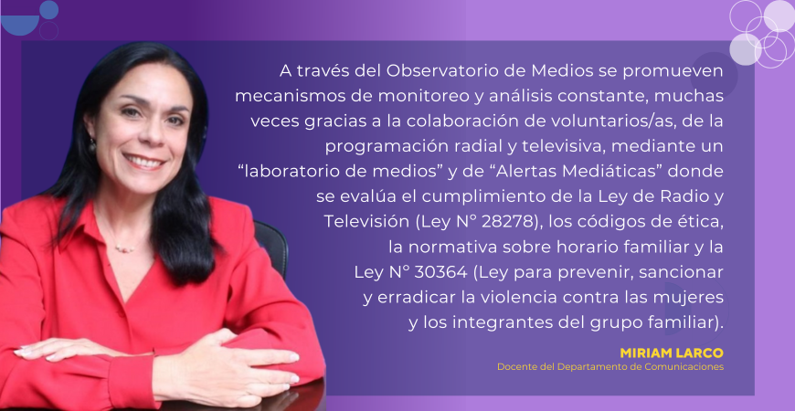 Miriam Larco explica que el Observatorio busca promover la reflexión sobre el consumo de medios y fomentar el cumplimiento del marco legal entre periodistas, directores y estudiantes de comunicaciones. Su labor apunta a que la ciudadanía pueda presentar denuncias y a que los medios mejoren sus prácticas, evitando la revictimización, la afectación a la dignidad y el sensacionalismo.