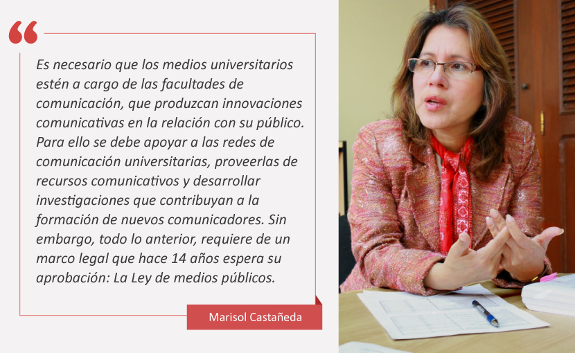 Para el caso de las universidades, se hace necesario, que los medios universitarios estén a cargo de las facultades de comunicación, que produzcan innovaciones comunicativas en la relación con su público. Para ello se debe apoyar a las redes de comunicación universitarias, proveerlas de recursos comunicativos y desarrollar investigaciones que contribuyan a la formación de nuevos comunicadores. Sin embargo, todo lo anterior, requiere de un marco legal que hace 14 años espera su aprobación: La Ley de medios públicos.